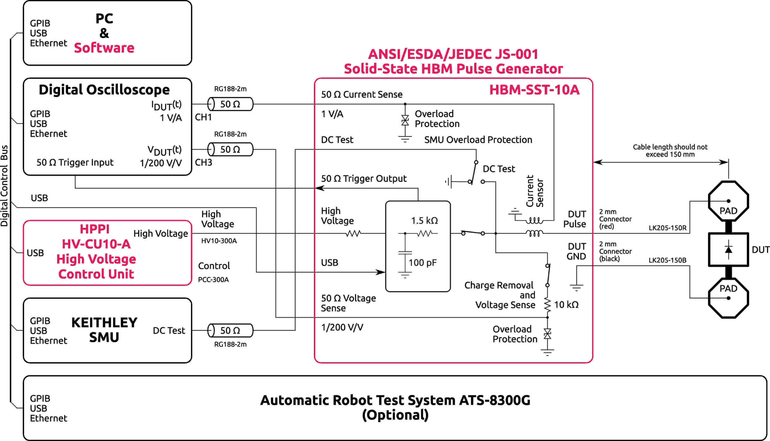- Integrated DUT HBM current sensor for real time transient current monitoring with 1V/A output sensitivity into 50 Ω digital oscilloscope input